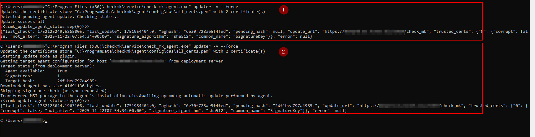 Verbinde ich mich auf einen solche Host und führe das Update manuell aus mit «“C:\Program Files (x86)\checkmk\service\check_mk_agent.exe” updater -v --force»