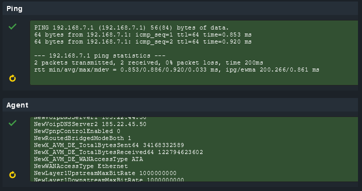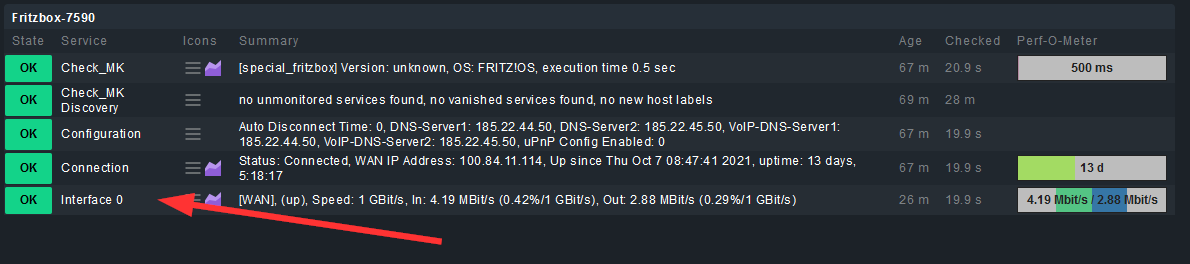 I am using the agent_fritzbox to get some statistics from my AVM FRITZ!Box 7590. I already added the Fritzbox as a host and added a rule at Setup → Agents → Other Integrations → Fritz!Box Devices in order to enable the fritzbox agent. So far, everything is up and running: