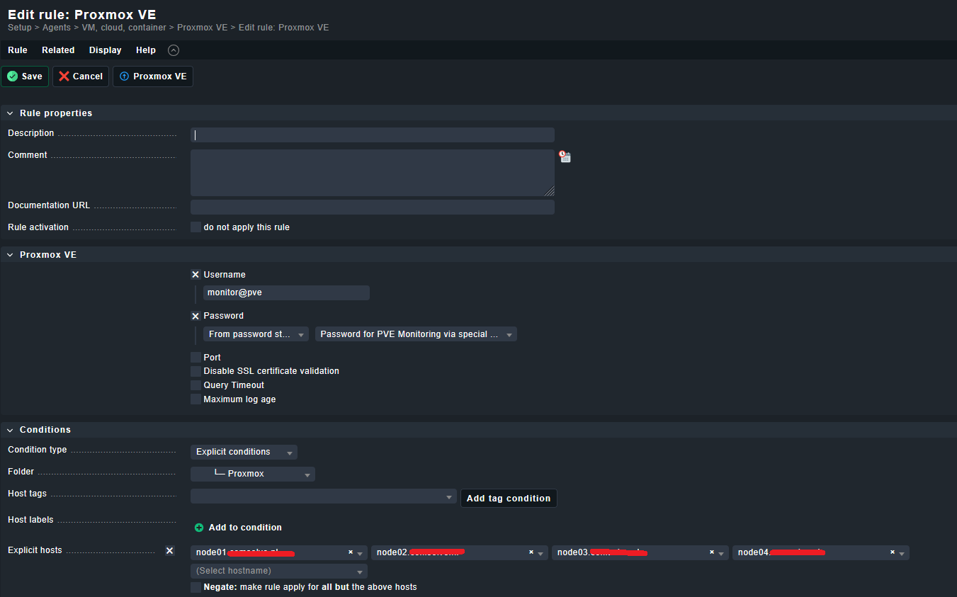 Keep the Checkmk Proxmox datasource rule unchanged (default: query all nodes).