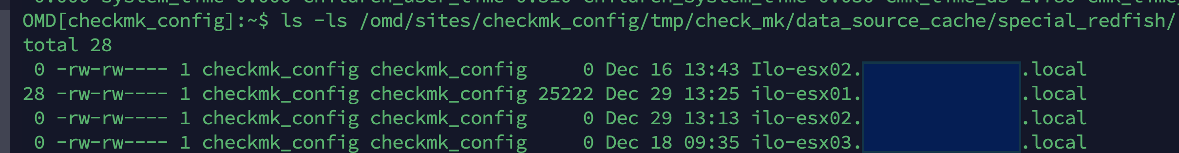 I also noticed that if you delete a host the cache (~/tmp/check_mk/data_source_cache/special_redfish) for that host is still there, but perhaps mostly a Checkmk clean up job? Also, not sure when, if the Agent was un-successful a cache file of 0 bytes was created. (yes all OOB are prefixed with âiloâ just an old habit)