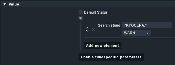 I tried this rule on my printer so stuff would go to a warning state when KYOCERA is mentioned, but I can’t get it to work on my 2.1.0.p5.cre.