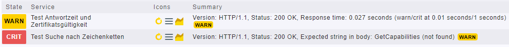 Allerdings habe ich inzwischen ein Problem gefunden. Dabei geht es um die “Suche nach Zeichenketten”. Das ist ein ganz wichtiger Bestandteil für den Test der Ausgabeseiten von unseren Diensten. Die Regel sucht im body nach der festen Zeichenkette “GetCapabilities”. Wird die nicht gefunden geht der Service nur auf WARN. In der ersten Logik ist das vielleicht in Ordnung, weil der Statuscode des Seite 200 ist. Stimmt der Webserver liefert erfolgreich eine Seite aus, daher stimmt der Statuscode 200. Die Seite enthält aber statt der korrekten Ausgabe nur eine Fehlermeldung und deshalb konnte die Zeichenkette nicht gefunden werden. Ich würde mir nun wünschen, dass der Service in diesem Fall auf CRIT geht. Immerhin antwortet unserer Dienst ja nicht korrekt.