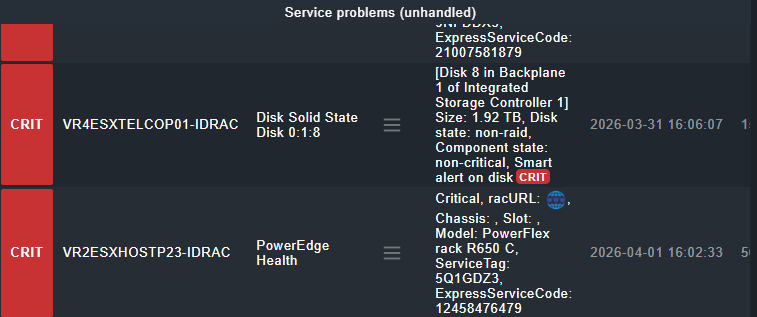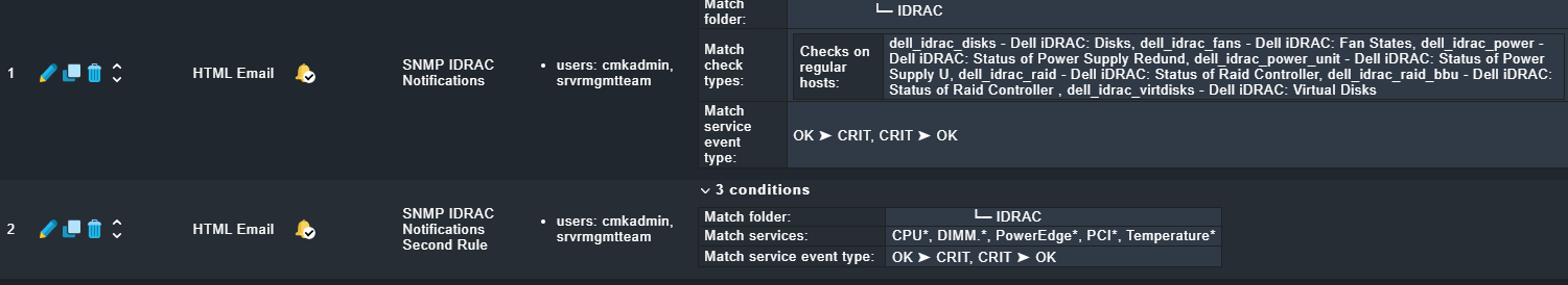 I have a CheckMK Docker implementation using SNMP to monitor 168 Dell physical hosts thru each IDRAC on each host. I have created two notification rules as shown in the embedded photos. The issue that I am not seeing email alerts sent out except for one host - VR3ESXHOSTP06-IDRAC. I have two rules created to: