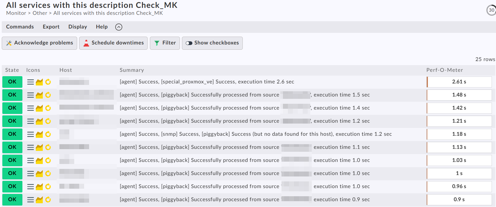 Ok, got it: There are some that take really long, more than 20s. Mostly switches via SNMP. Also quite a few pyhsical servers are above 3-4s. The rest, mostly VMs, seem fine, below 1s. How can I tune from here? What can be possible bottlenecks if not simple CheckMK host resources?