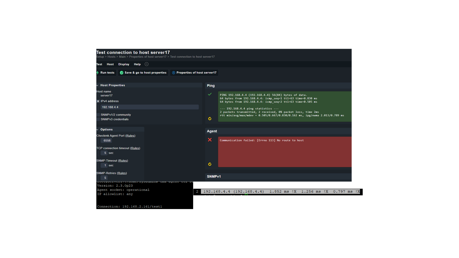 I notice that the cmk agent wasn’t pulling new data, I re-installed the agent, register the host check the agent status and everything looks fine but I keep having the error when I check the connection on host setup. Doing a traceroute from the cmk server to the host server give me an error.