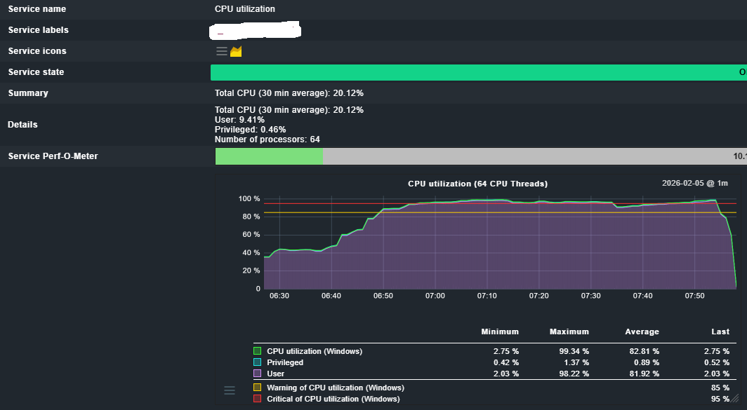 Kurz und knapp — das ist die wahrscheinlichste Ursache. Wie @r.sander es treffend formulierte: die Warn/Crit-Schwellen stehen auf 101%, deshalb gibt es keine Notification, egal wie hoch die CPU geht. Checkmk Der Graph zeigt immer die echten Messwerte unabhängig vom konfigurierten Schwellwert — das täuscht, weil es so aussieht als würde der Service den Wert „sehen", obwohl intern kein Zustandswechsel ausgelöst wird.