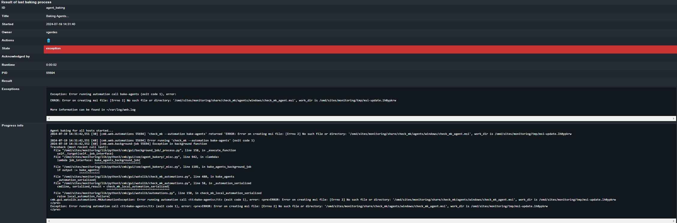 Error message: ERROR: Error on creating msi file: [Errno 2] No such file or directory: ‘/omd/sites/monitoring/share/check_mk/agents/windows/check_mk_agent.msi’, work_dir is /omd/sites/monitoring/tmp/msi-update.lh0ypkrw