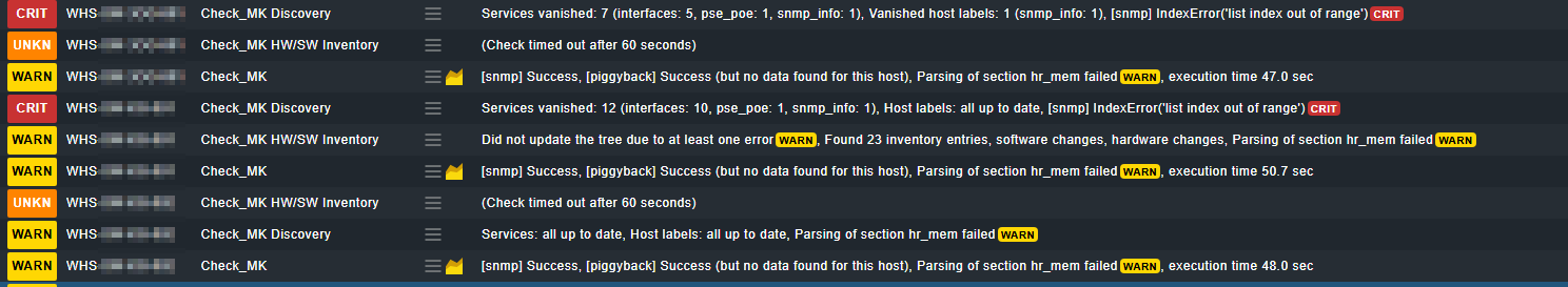 Wenn die SNMP-Abfragen auf 3 Standorten laufen und in der Zentrale nicht, lässt das ggf. auf eine komische SNMP-Konfiguration oder eine andere Firmeware schließen. Es sieht für mich so aus, als würde der SNMP-Walk nicht zum Ende kommen, was zum Timeout führt. Du kannst ja mal prüfen, ob es besser wird, wenn du hr_mem als SNMP-Sections ausschließt. Wie überwachst du die Fortinet-Geräte, mit V1 oder V2 oder V3?