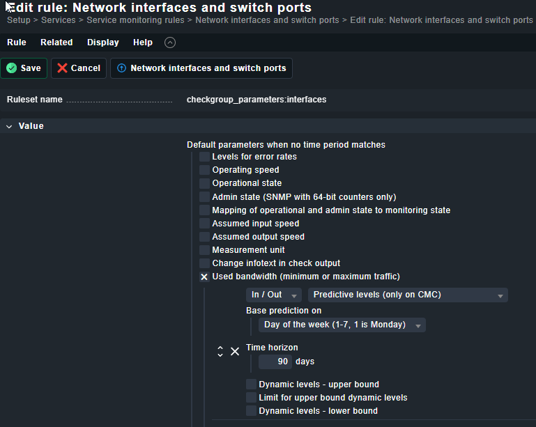 Activate Predictive Levels with very generous initial limits (e.g. WARN: +300%, CRIT: +500% of predicted value) — these won’t fire in practice, but they start the baseline building