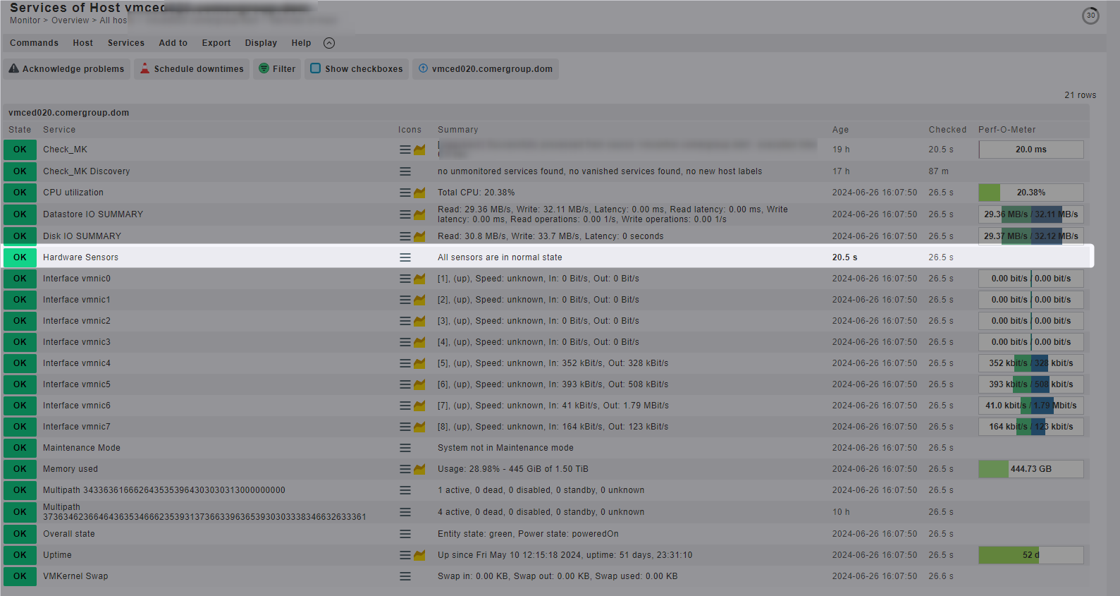 This check checks the state of all of a VMware ESX host system’s hardware sensors - including temperatures, fans, power supplies, memory DIMMS, hard disk, an others. In order to avoid network traffic the agent sends only information about sensors that are not in green state.