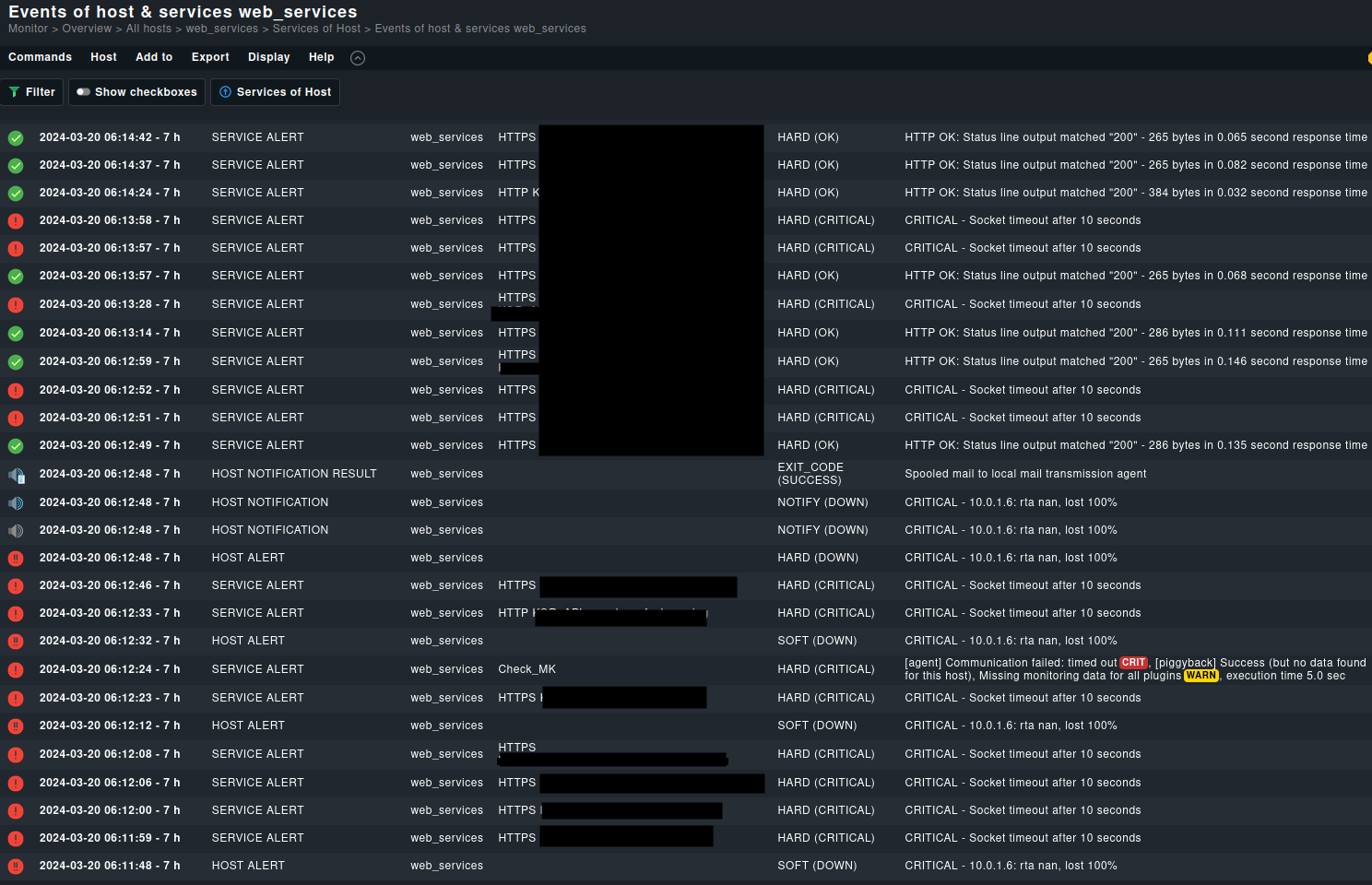 It shouldn’t be a host downtime and theses actives check in the same time ? We check our logs from the webservices (the monitored server) It appears that we didn’t receive the packet, but still, it shouldn’t be HARD(CRIT) as we’ve 3 checks attemps and we received the next one (1 min later and so on)