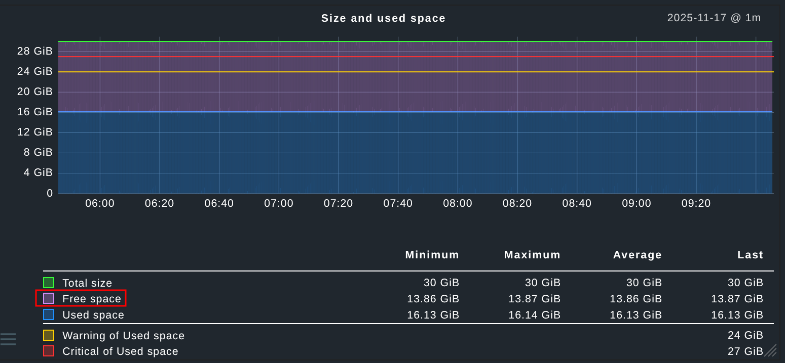 For your information, free_space is also displayed in the “Size and Used Space” chart, but it’s often barely noticeable on very large file systems. My colleagues actually look at this chart frequently because it allows you to quickly see the development of free_space.