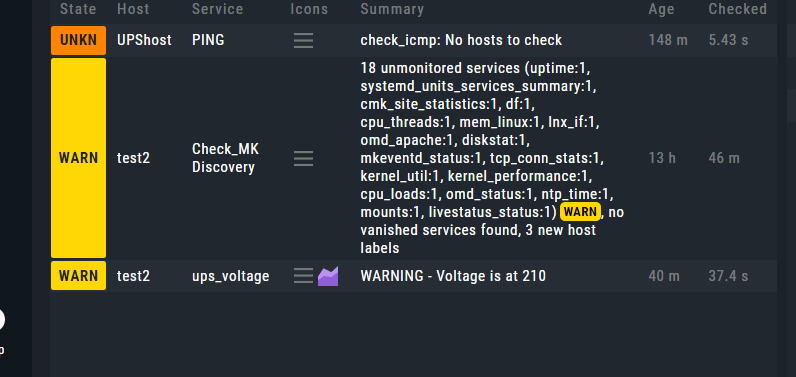 remove the line with echo <<<local>>> from mylocalcheck. Wait three minutes or so, and recheck your host in “Setup”: Theoretically, your host should discover two new services. This would “fulfill” the scenario of having services which refer to the UPS, associated with your “main host”.