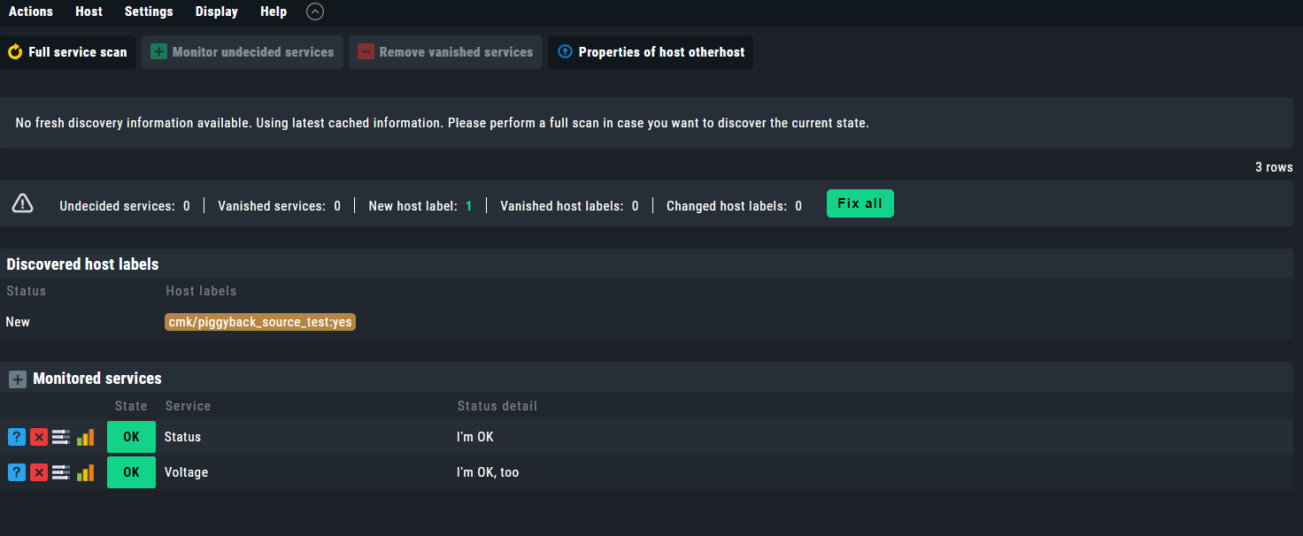 add both lines with echo <<<<otherhost>>>> and the line with echo <<<local>>> to mylocalcheck. Again, wait three minutes or so. Theoretically piggyback data should exist now, your host should “lose” the two services it discovered before, and if you discover services for “otherhost” it should find them. This would result in having two hosts in Checkmk: your main host, and the piggybacked one.