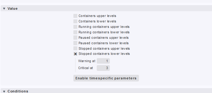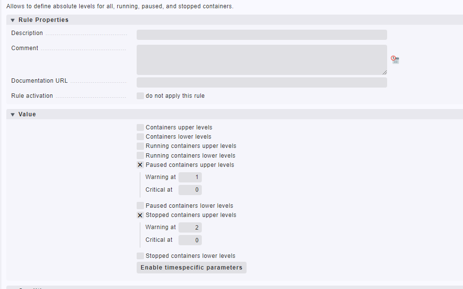 Note that this rule won’t help if the container gets deleted (docker rm). You need to monitor the container itself (by using the piggyback data from the host) to get informed when a specific container disappears.