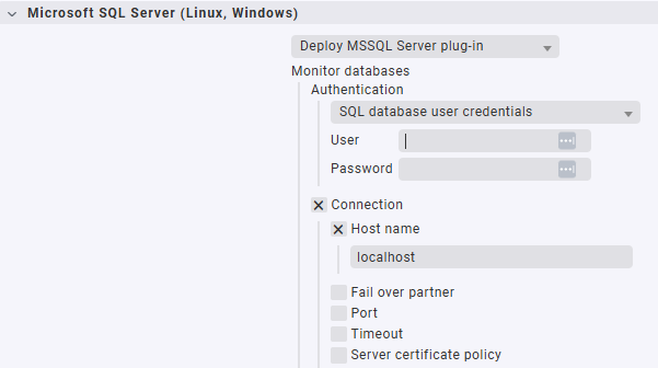The monitoring should be done by a device with Checkmk Agent + SQL Plugin. In Agent Bakery you can define the parameters: