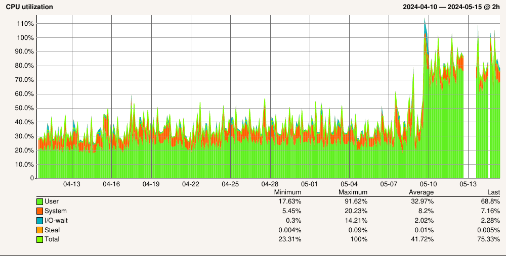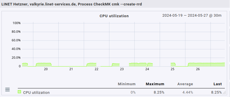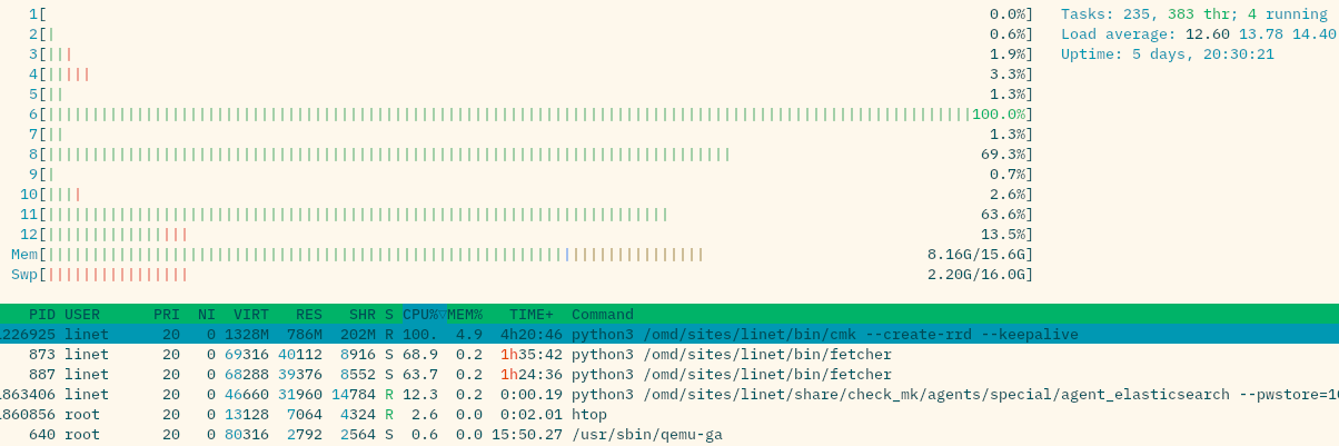 On top of this insanely high memory & CPU usage updating the metrics often just stops. No correlation to be found yet. The cmk --create-rrds process is running, it’s still at 100% CPU (= according to htop, meaning one core fully, constalty used), but it just isn’t updating anymore. Always have to omd restart in such a case. Happens multiple times a day, some days doesn’t happen at all.