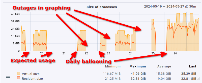 Sometimes activation after changes causes the process to go down to nothing at all, sometimes it causes the reverse. However, each and every night at around 3 AM its memory usage balloons to insane amounts of memory. Currently it’s sitting at over 32 GB of RSS (VSZ is obviously even higher):