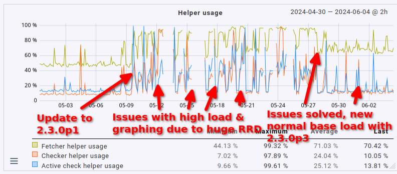 This fix slightly reduced the overall load on the server as well by 1 CPU core (no big surprise here, it was using 1 CPU core constantly before). What’s definitely nice is that the fetcher usage also dropped from > 90% to around 60 to 70% (that’s roughly where it sat before the update, too, just slightly higher). That being said, the load avergage/CPU usage helper user is still roughly twice as high as it was before the update (CPU load around 8 to 9, up from 3 to 4; CPU usage around 60%, up from 35%).