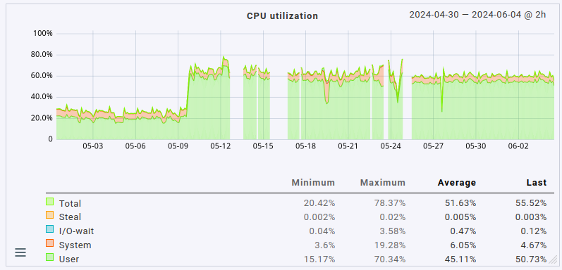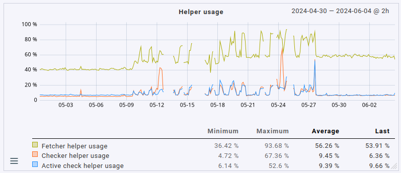 Lastly, in case anyone is interested in how this presents in graph form, maybe for comparing it to their own situation: here’s the CPU load average, CPU usage & fetcher usage over the last 35 days.