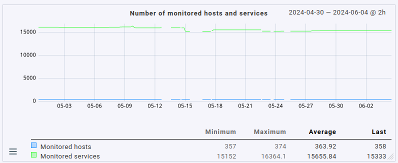 Please note that the total number of monitored hosts & services has actually gone down slightly as I’ve moved several hosts to a different site in the early, problematic days of running 2.3.0p1.cee: