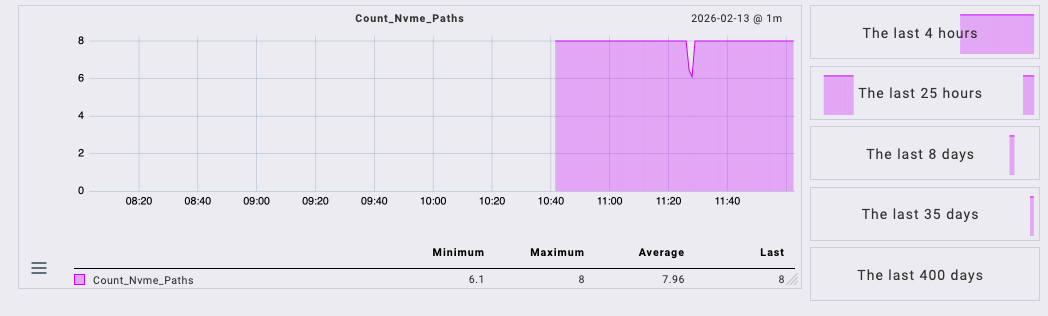 NVMe multipath NetApp ONTAP Controller Number of paths: 8, Number of paths in state live: 8 (count_nvme_paths=8;;;0; count_nvme_paths_live=8;;;0; count_nvme_paths_new=0;;;; count_nvme_paths_connecting=0;;;; count_nvme_paths_deleting=0;;;; count_nvme_paths_resetting=0;;;; count_nvme_paths_dead=0;;;;)