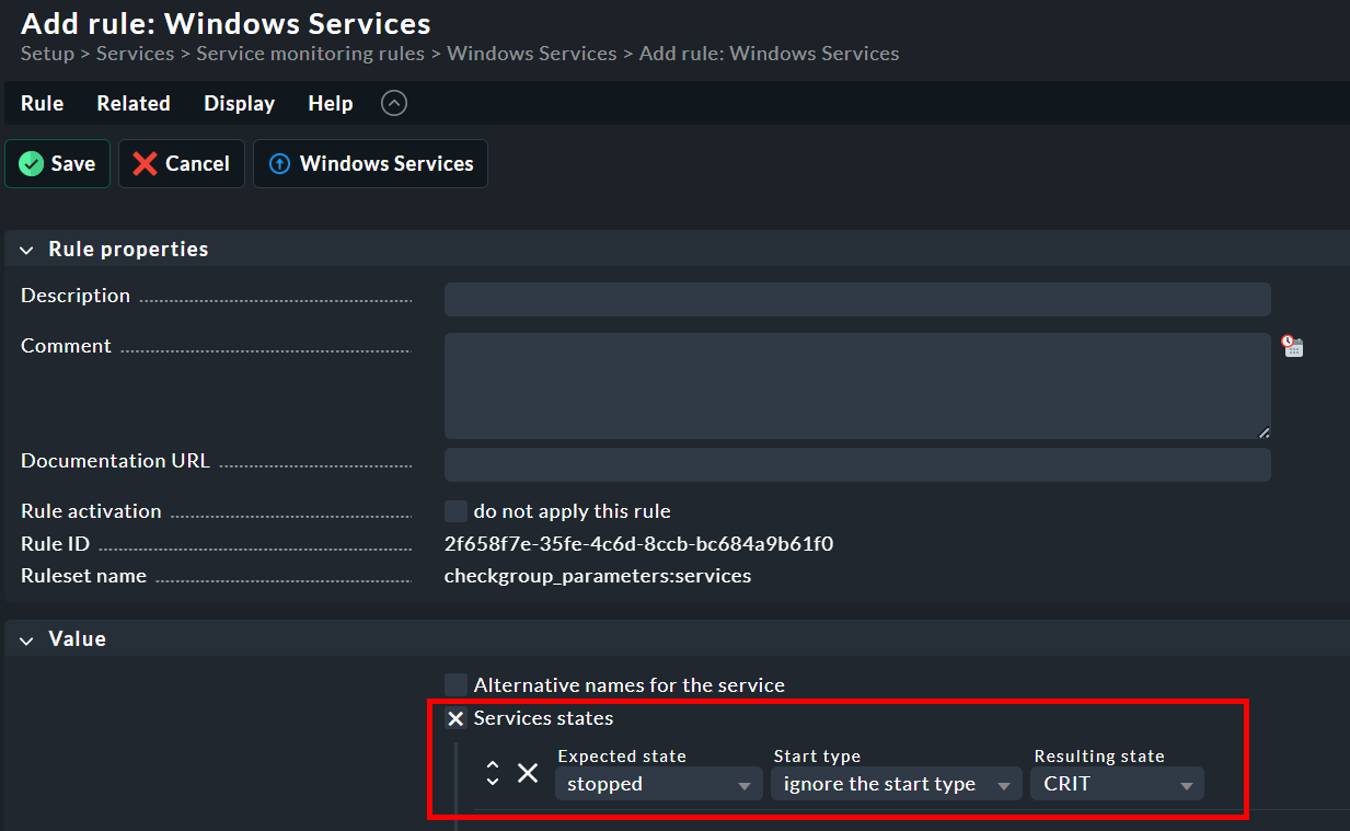 Use the “Windows service discovery” rule to identify the desired Windows Services on your host. - Configure Service States