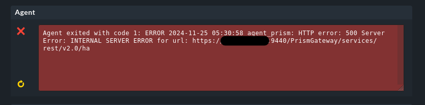 Output of “cmk --debug -vvn hostname”: [special_prism] Agent exited with code 1: ERROR 2024-11-25 05:39:10 agent_prism: HTTP error: 500 Server Error: INTERNAL SERVER ERROR for url: https://XXXXXXXX:9440/PrismGateway/services/rest/v2.0/ha(!!), [piggyback] Success (but no data found for this host), Missing monitoring data for all plugins(!), execution time 1.7 sec | execution_time=1.660 user_time=0.060 system_time=0.010 children_user_time=0.440 children_system_time=0.070 cmk_time_ds=1.090 cmk_time_agent=0.000