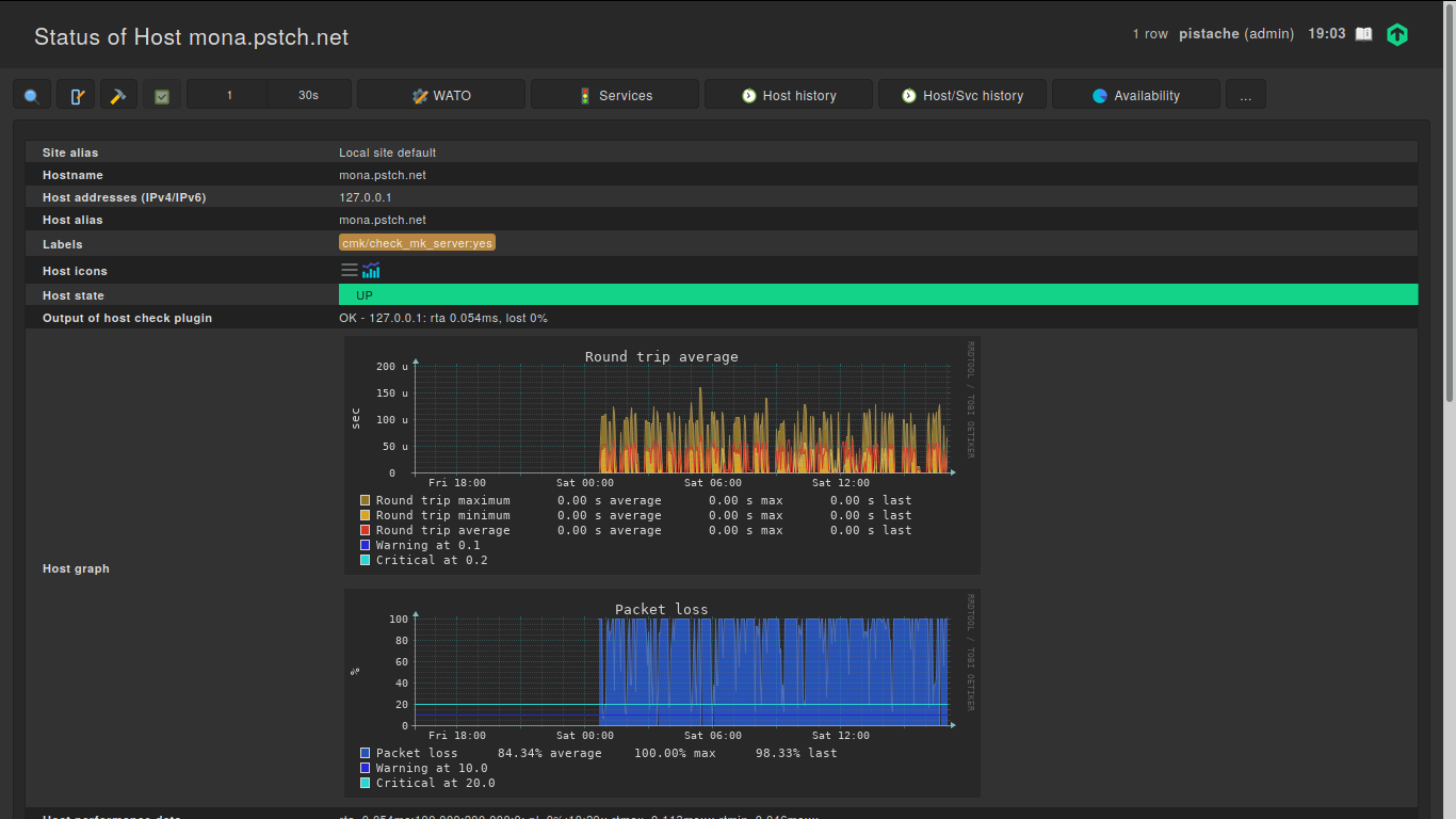 Hi ! I’ve recently moved a CheckMK instance (with ~15 hosts, 300 services) from a container host to another (using rsync), and all of the hosts that existed before the migration (including localhost) have now started showing intermittent severe (100%) packet loss. However, the host check never fails, and although CheckMK shows the packet loss in graph of the host status page, the host is always up, and all services are monitored without interruption. Also, new hosts that were created after the migration don’t exhibit this behaviour.