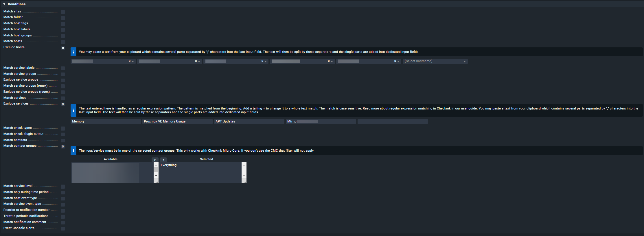 I created for each site a contact group and assigned each user the corresponding group. For global admins there is the group everything so they get notified about any issue/problem. And there we only excluded some hosts and some services, but there is no configuration for the host event types in place.
