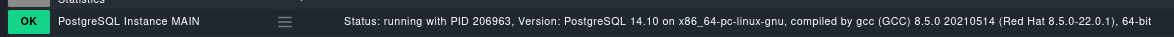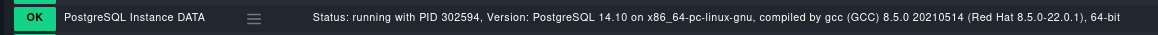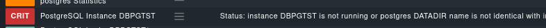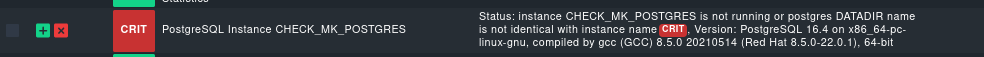 The problem is : Status: instance CHECK_MK_POSTGRES is not running or postgres DATADIR name is not identical with instance nameCRIT, Version: PostgreSQL 14.10 on x86_64-pc-linux-gnu, compiled by gcc (GCC) 8.5.0 20210514 (Red Hat 8.5.0-22.0.1), 64-bit