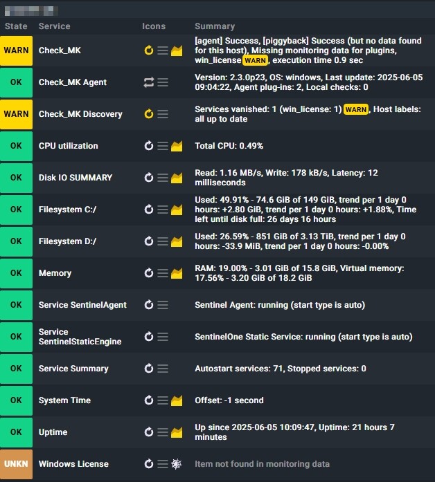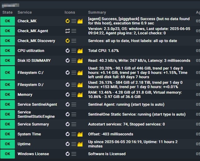 2025-06-11 11:16:49.638 [srv 4212] perf: In [63] milliseconds process ‘“C:\ProgramData\checkmk\agent\plugins\win_license.bat”’ pid:[1904] SUCCEDED - generated [0] bytes of data in [0] blocks