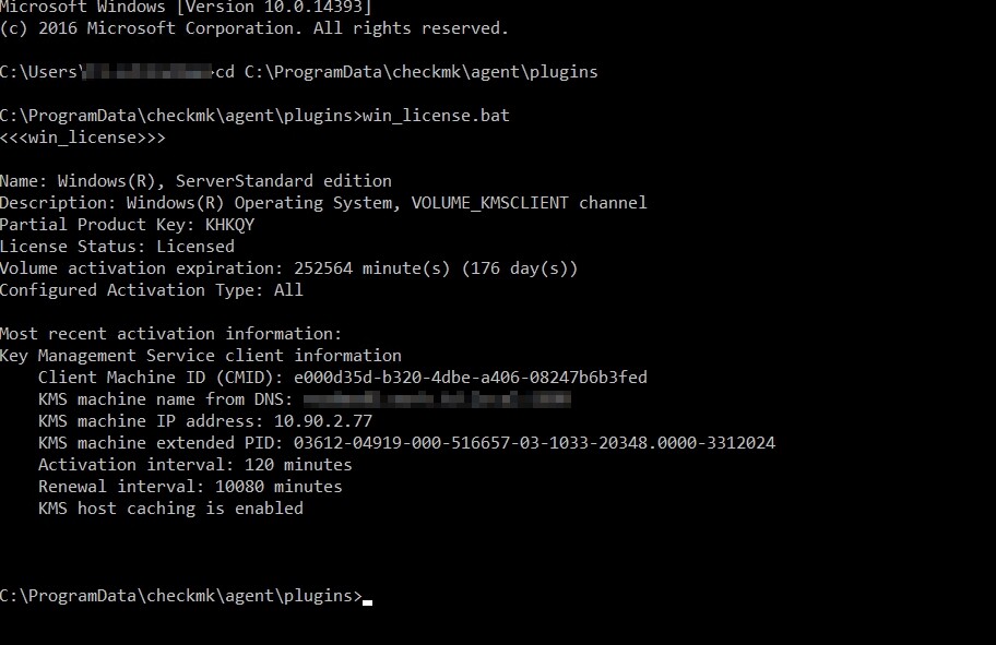 Then later you can download the agent output from the CheckMK gui. There you should look for the header line “win_license_ps”. But remember to configure a cache time for the plugin.