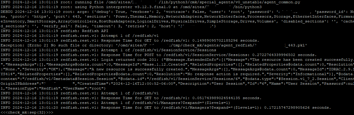 HostKey(hostname='TEST', source_type=<SourceType.HOST: 1>) -> Add sections: ['check_mk', 'redfish_chassis', 'redfish_drives', 'redfish_ethernetinterfaces', 'redfish_firmwareinventory', 'redfish_manager', 'redfish_memory', 'redfish_networkadapters', 'redfish_networkinterfaces', 'redfish_power', 'redfish_processors', 'redfish_storage', 'redfish_system', 'redfish_thermal', 'redfish_volumes']