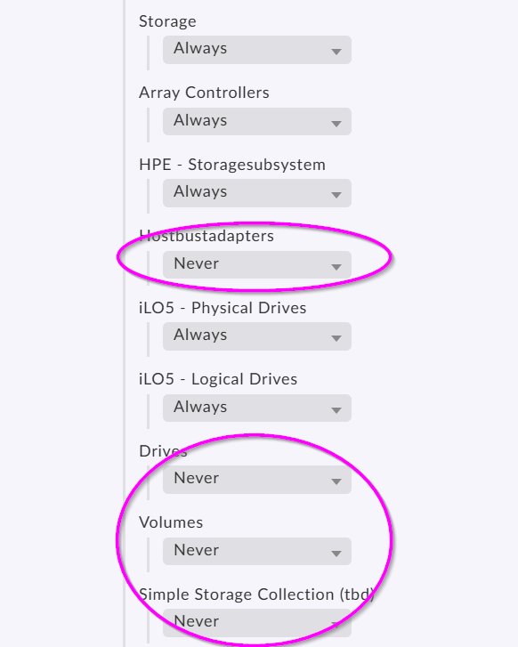 For iLO 5 would recommend to disable the following sections inside the special agent config.