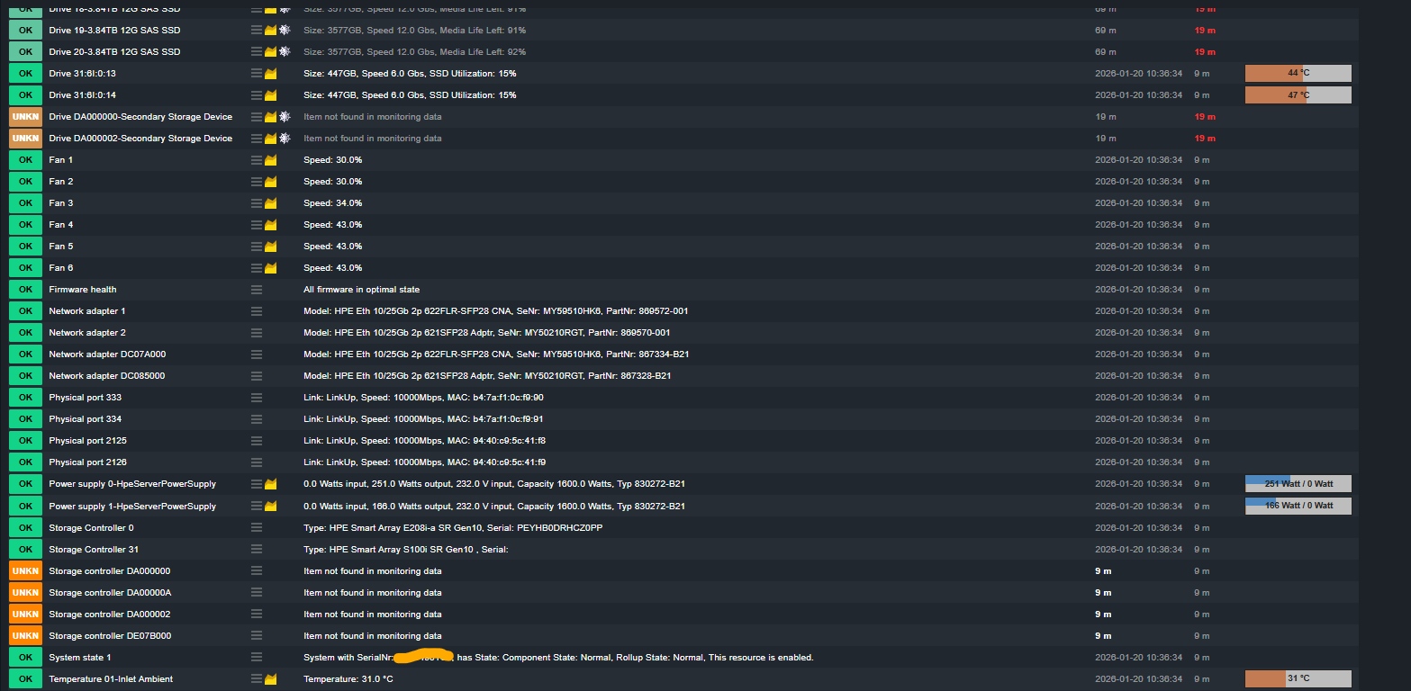 I have this problem on one ILO Host in CheckMK which I used to test the redfish Plugin before rolling it out to all ILO Hosts. Occasionally, the Network Adapters are vanishing. I think it is always just one, on the next check the other and than both are back for some time. I could find any more logs so far, the cmk --debug -vvn hostname doesn’t show any error, just the message above. Any idea how I can provide more information?