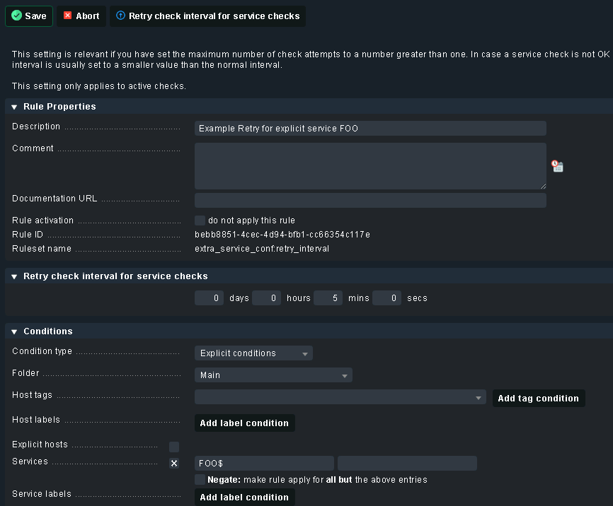 The services (or hosts) a rule applies to is determined by the conditions. So if you don’t define any conditions, the rule is applied to all services / hosts. If you define a condition (i.e. a name, or a regex, or a tag, or a label, or a specific folder, or, or, or… ) it is applied to all those services or hosts where the condition matches.