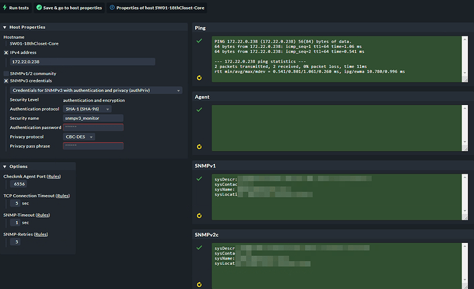 My problems are, after entering a new host (with SNMP credentials for SNMPv3 with auth and authPriv), I clicked on “Save & go to connection tests”, I see the following: