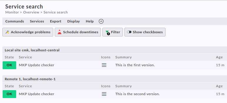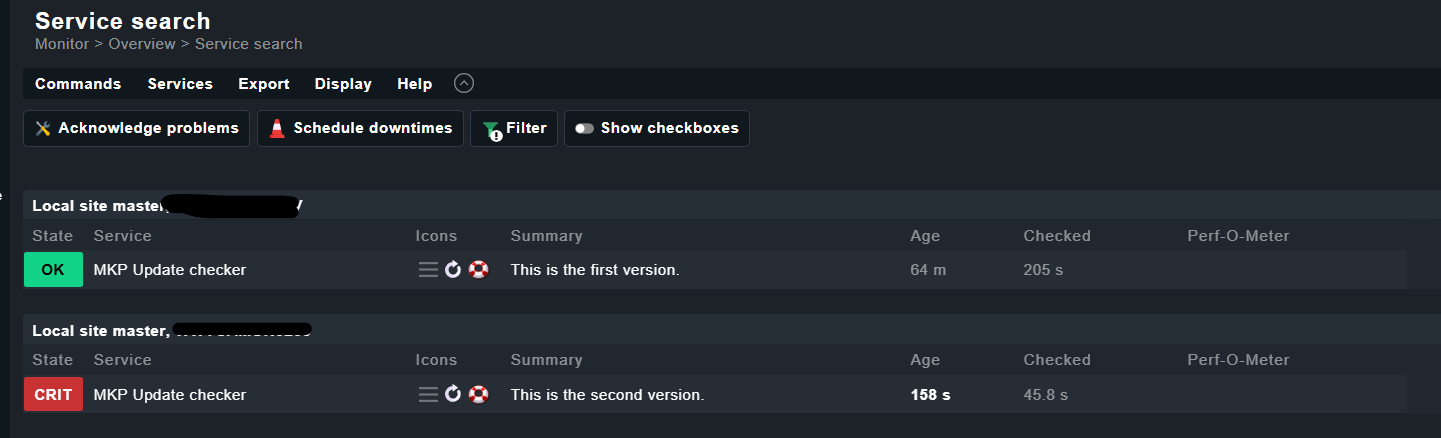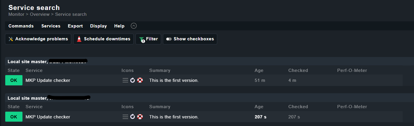 Installing mkp-update-checker 1.0.1 shows me the service as expected on two hosts: