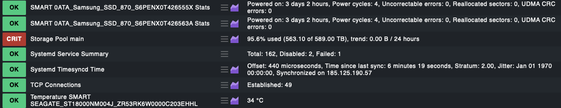 As you can see above the only three devices found by the smart plugin is my two boot SSD’s who are directly connected to my motherboard and one random disk through the HBA, disk /dev/sdp.