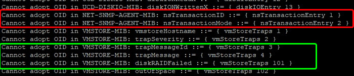 When I do an SNMP walk from CLI using root user, it can see the VMstore MIB, but has some issues.