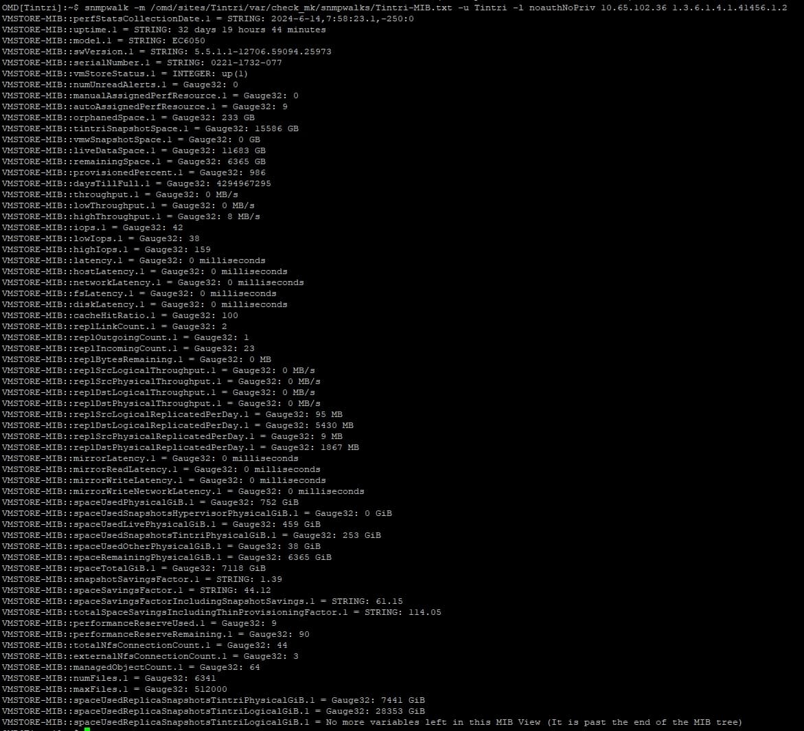 I placed the MIB under /omd/ sites/ Tintri/var/check_mk/snmpwalks/Tintri-MIB. txt and some other folder.