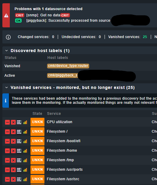 Check_MK service reports [snmp] Success. cmk --debug -vvn hostname shows all the SNMP data. Check_MK Discovery shows the services as “services unmonitored” and a periodic discovery rule does eventually add new services. SNMP is working!