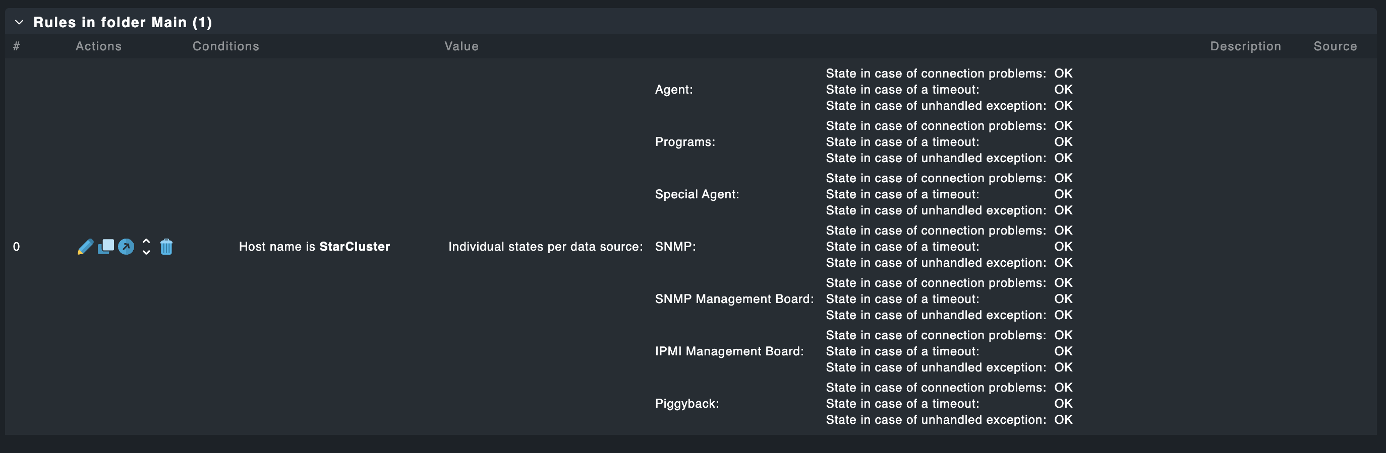 Hence I added the rule “Status of the checkmk services” which matches the hostname of the cluster (StarCluster):
