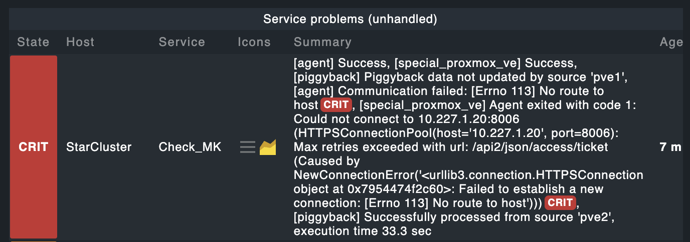 I have a proxmox cluster with two nodes+qdevice and one of them can be offline. Hence the “Check_MK” service fails if it can’t connect to both nodes via API or agent.