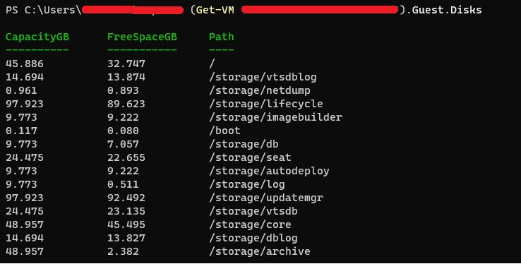 Also, if the VM has VMware Tools installed (which most of them do, if not all) you get to see even more metrics like per disk usage. Example from one of our VMs using powercli: