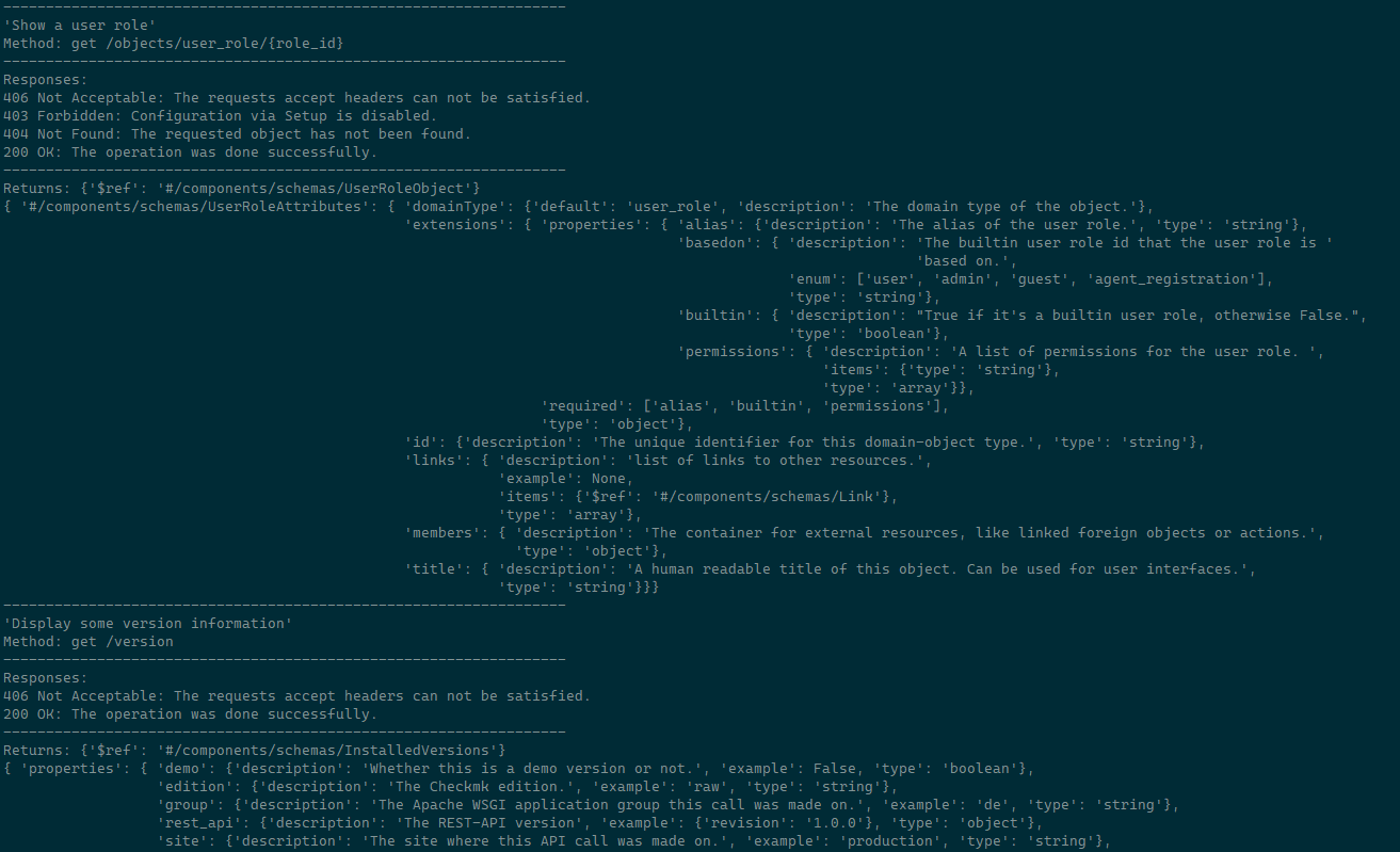 I copy the ~/var/check_mk/rest_api/spec/swagger-ui.spec from each version and parse it when needed. My parser outputs everything in a (for me) readable way in console: