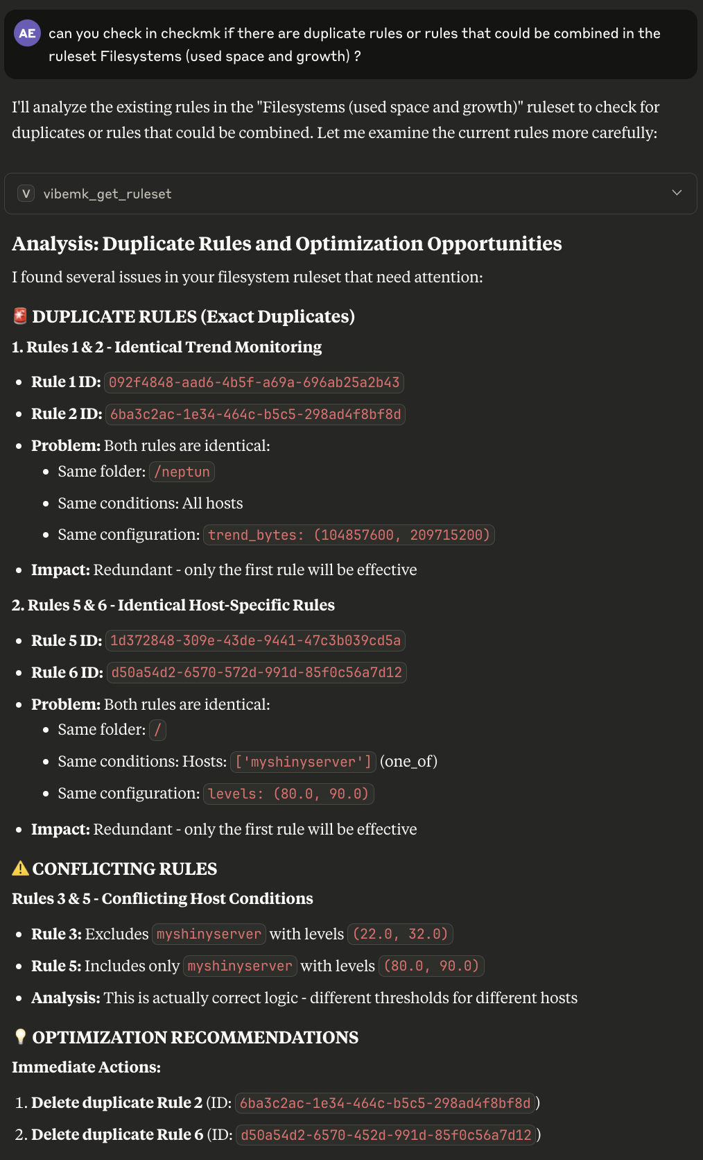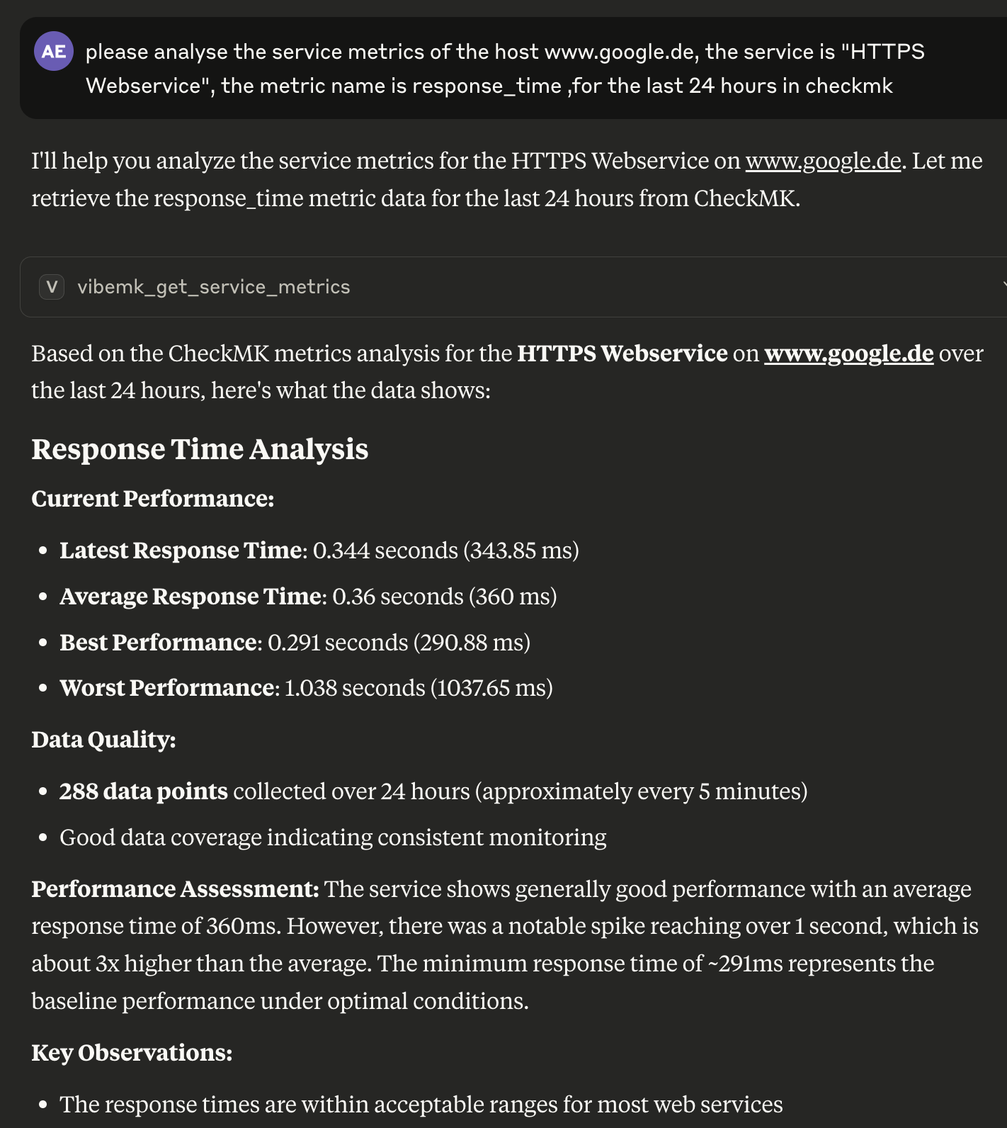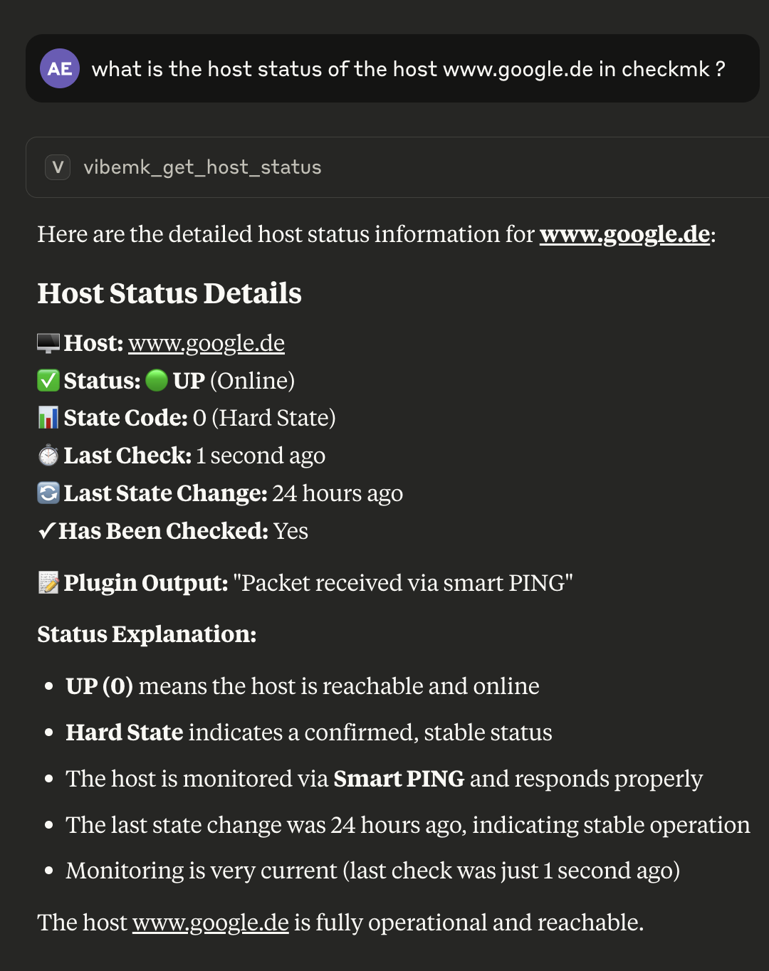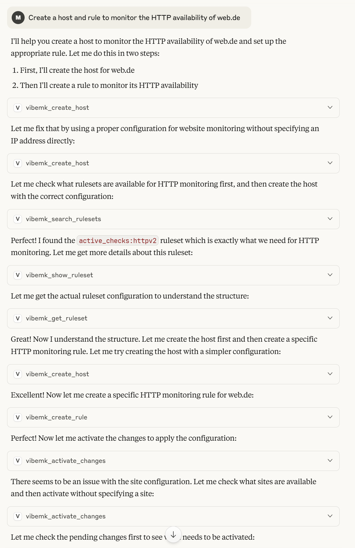 Having said that, I can only express how impressed I am with what is currently possible with this combination of an LLM and checkmk (after two days of “development” ) and I think there will be a lot usecases where this might be really useful, e.g. analysing historical data, checking best practices, repeating tasks and so on.