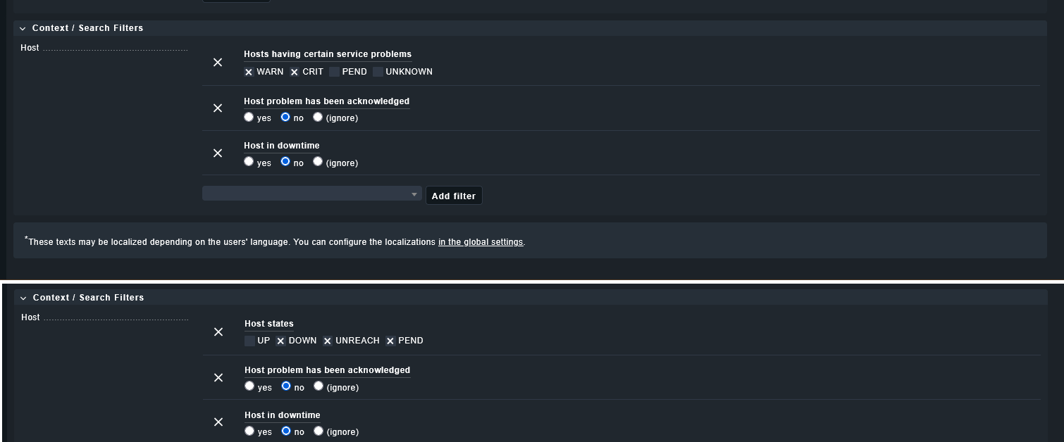 I have a custom dashboard with 2 views, where i just want to monitor Down state hosts and Services Warn&Crit, which have been not ackowleged nor in downtime.