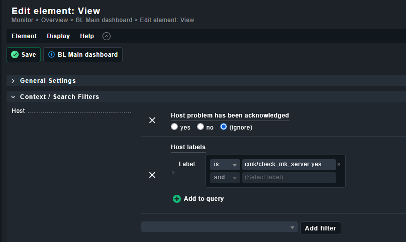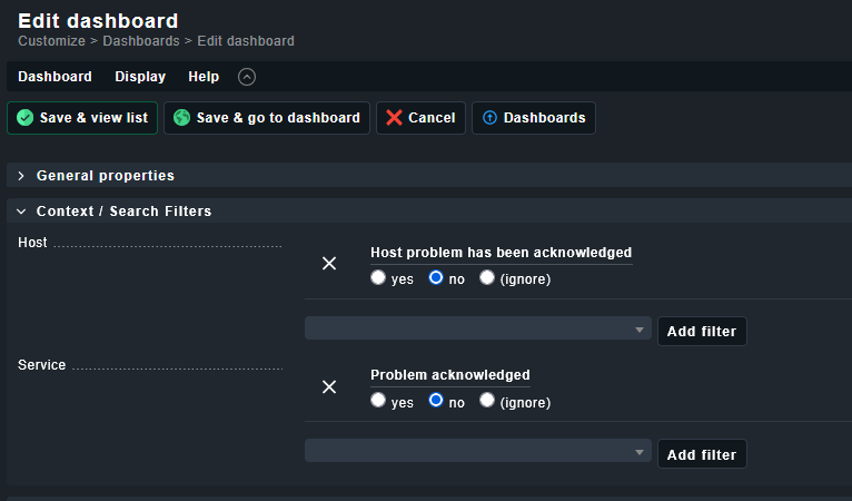 The filters are applied in the views, because if i apply those filters on my main dashboard, it would filter out other views, where i want to see acknowledged problems